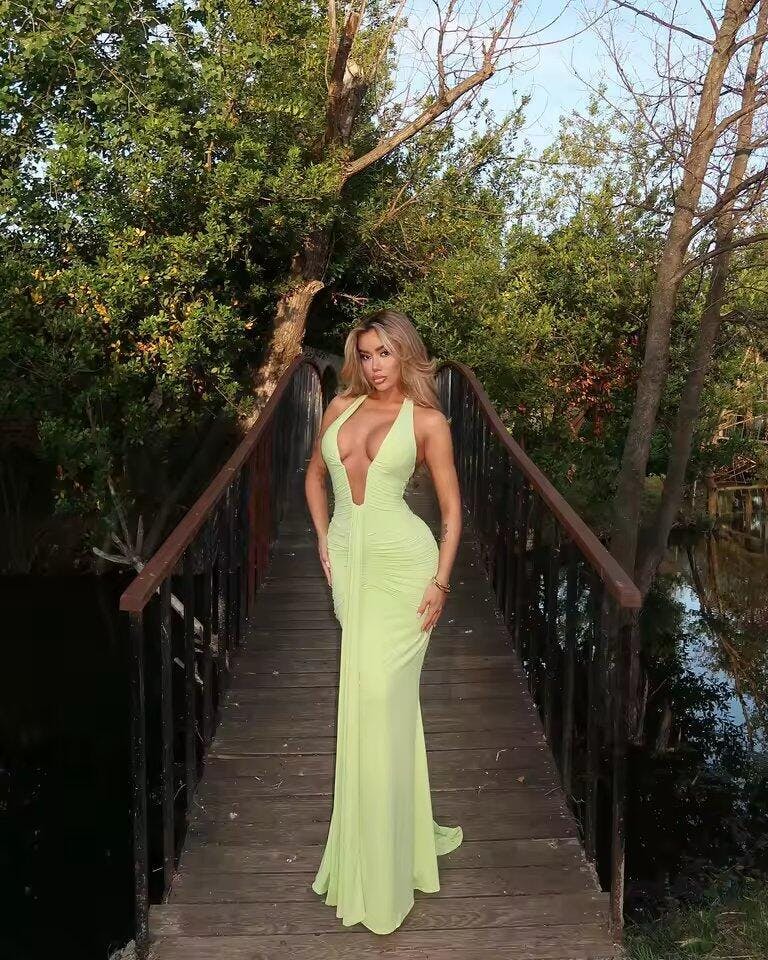 Stunning dress, very similar to JL's. The skirt is short and the dress is generally low-cut, so I don't recommend it to curvy girls and nothing is visible. It is also indicated in the photos, so it's okay.