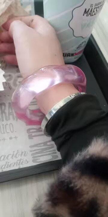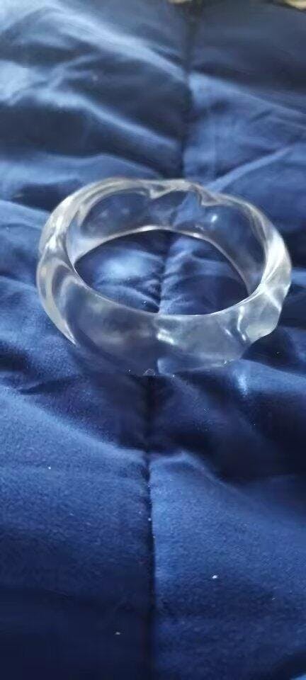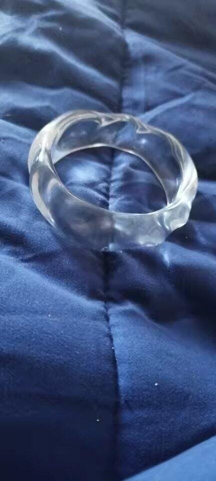 such a pretty piece!!!! the pearly finish looks dreamy in the light and the chunky shape makes it stand out instantly. beautiful, no seams anywhere, doesn't scratch, not cloudy, of course wide for thin hands, but basically you can walk with it and it doesn't slip off