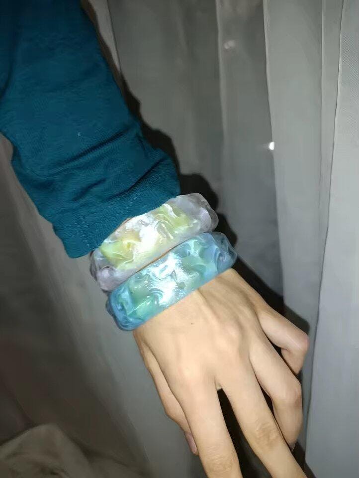 This bracelet looks like actual ocean light on your wrist ! ! The blue tones are soooOo calming and the resin texxture catches the light beautifully. It’s chunky but not heavy at all . I love wearing it alone as a statement piece. Feels very fresh and clean