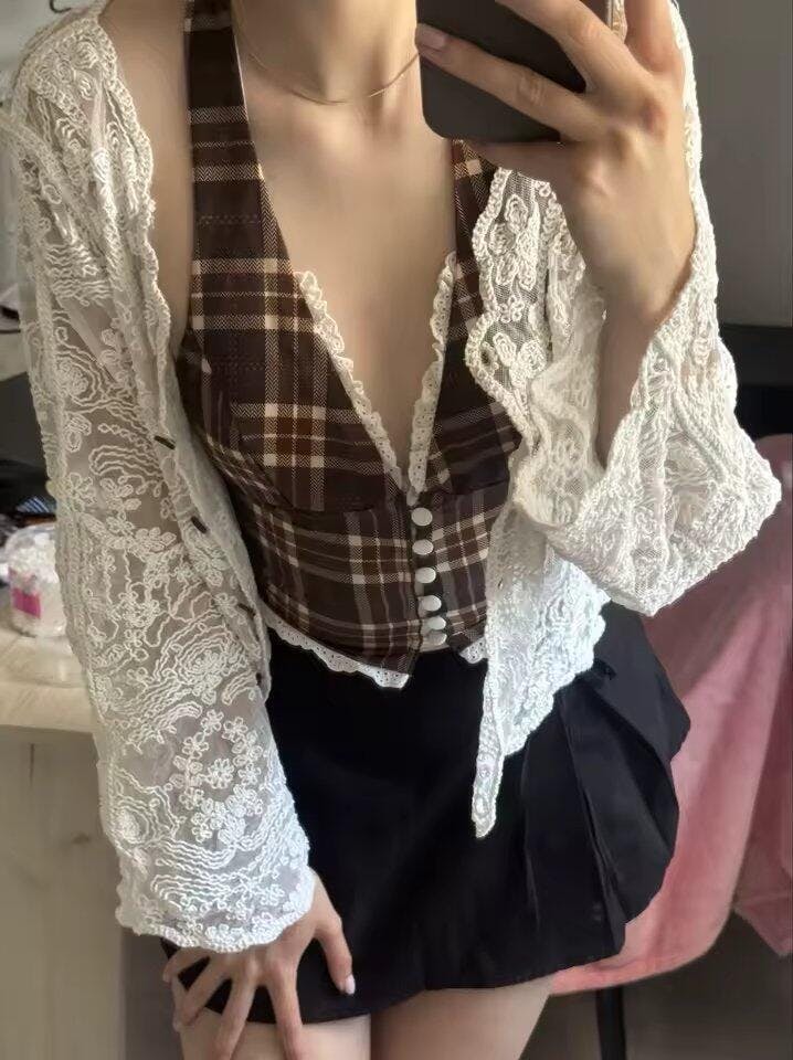 قميص علوي برقبة هالتر منقوشة بنمط مربعات عتيق