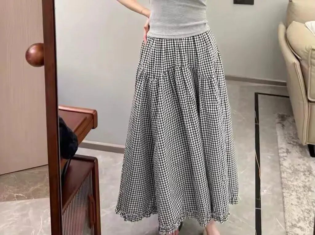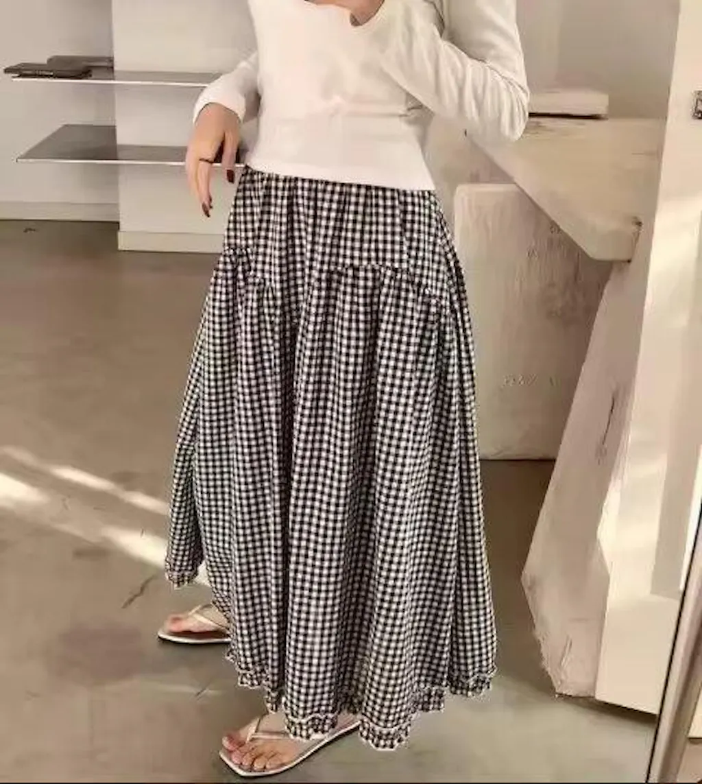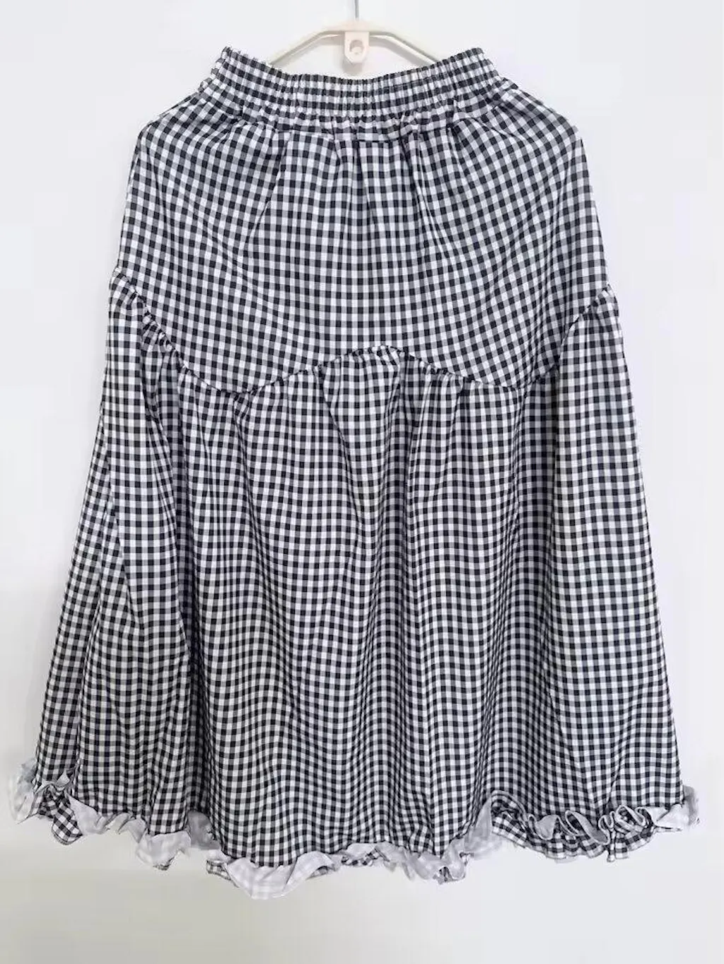 깅엄 티어드 미디 스커트