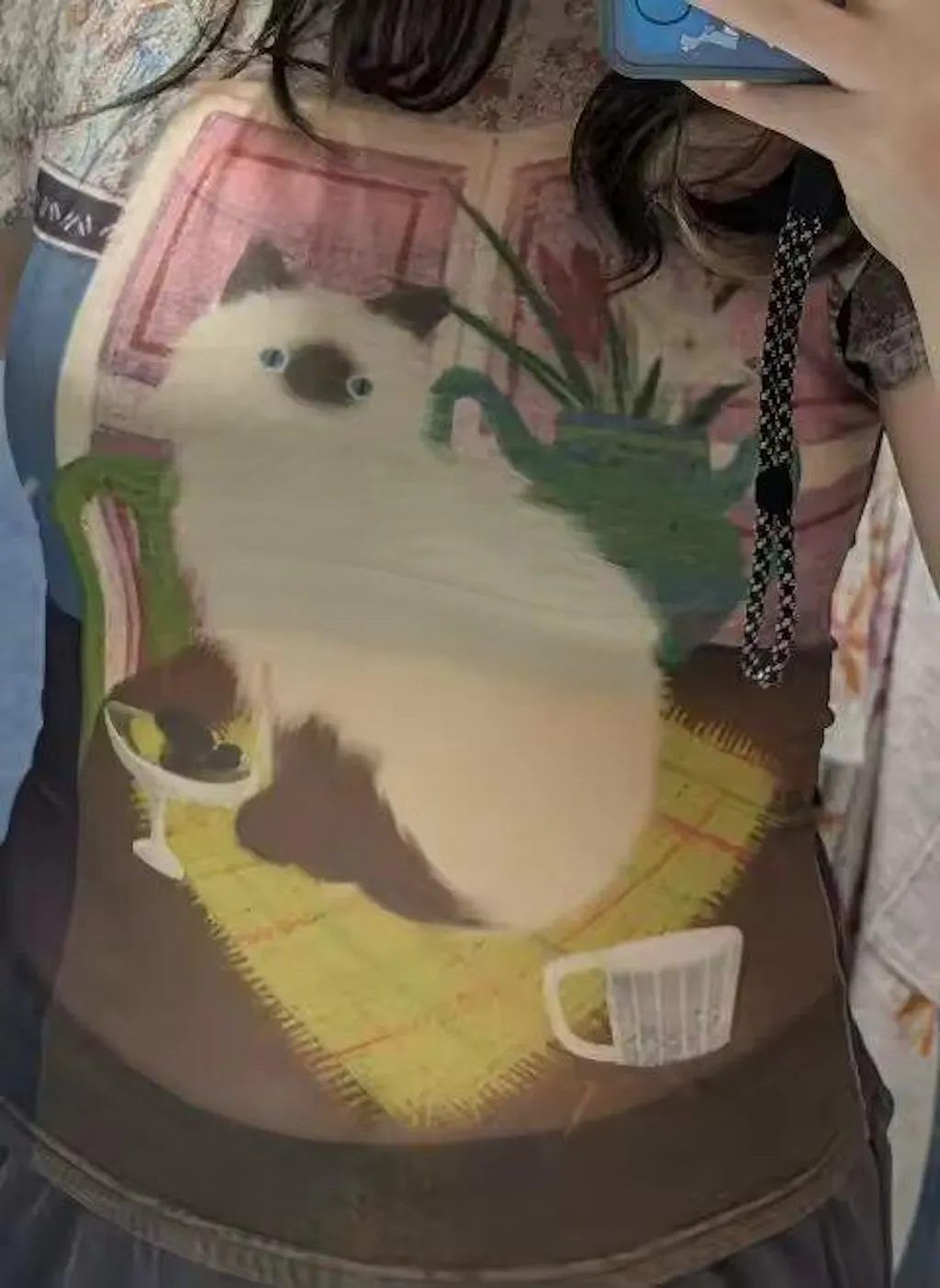 Playful and quirky, this fitted mesh tee pairs a vintage-style cat print with a sheer back and patterned sleeves. Lightweight and breathable, it brings a pop of personality to Y2K streetwear, perfect for layering over bralettes or pairing with cargo pants.